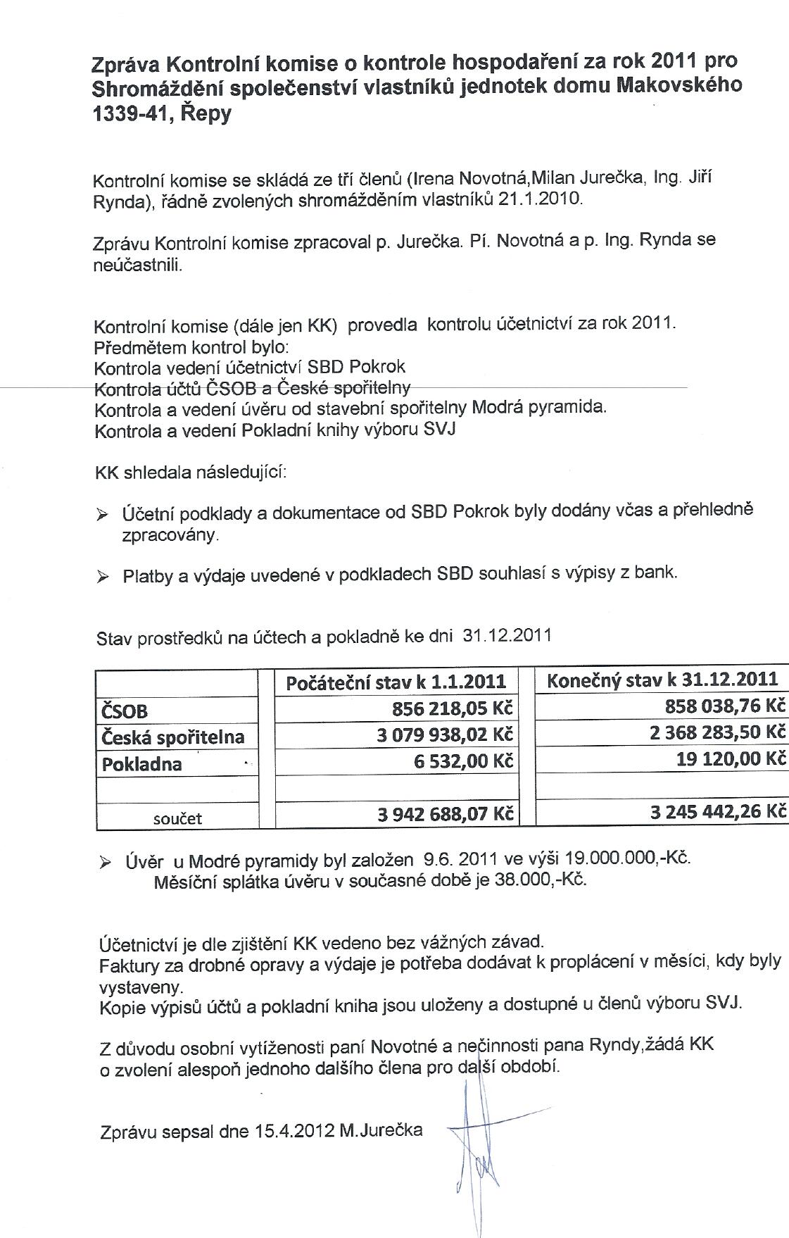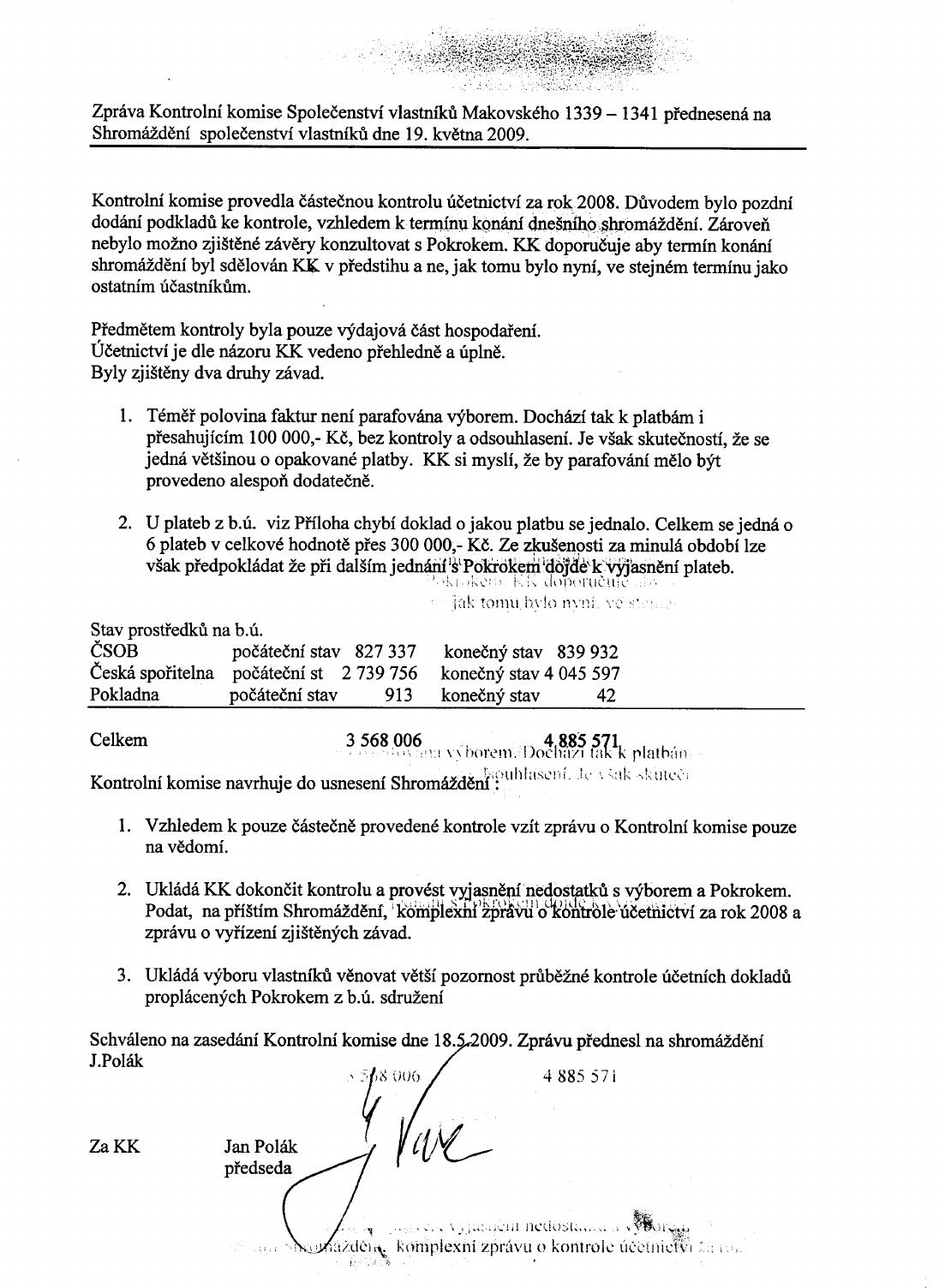 Zpráva Kontrolní komise o kontrole výsledků hospodaření za rok 2009 pro Shromáždění společenství vlastníků Makovského 1339-41.