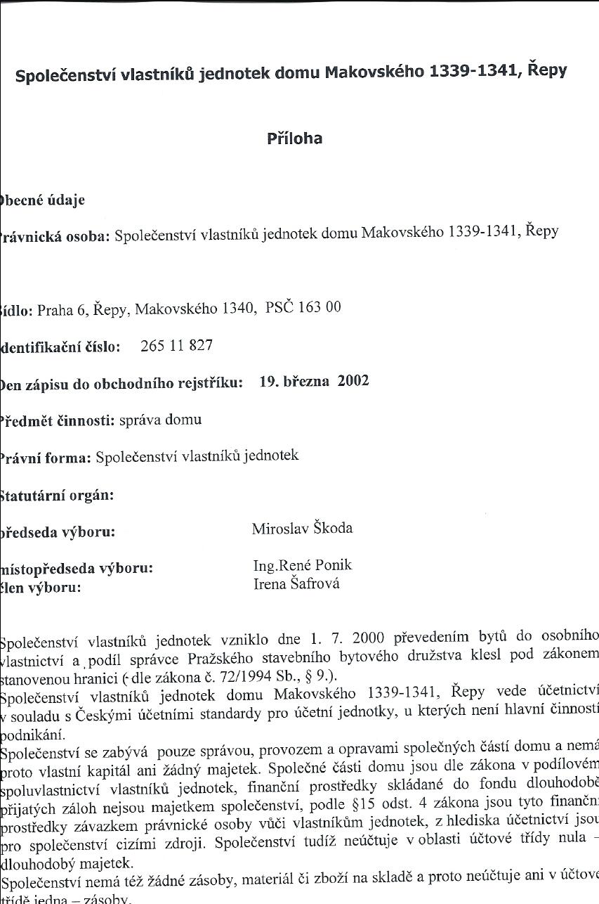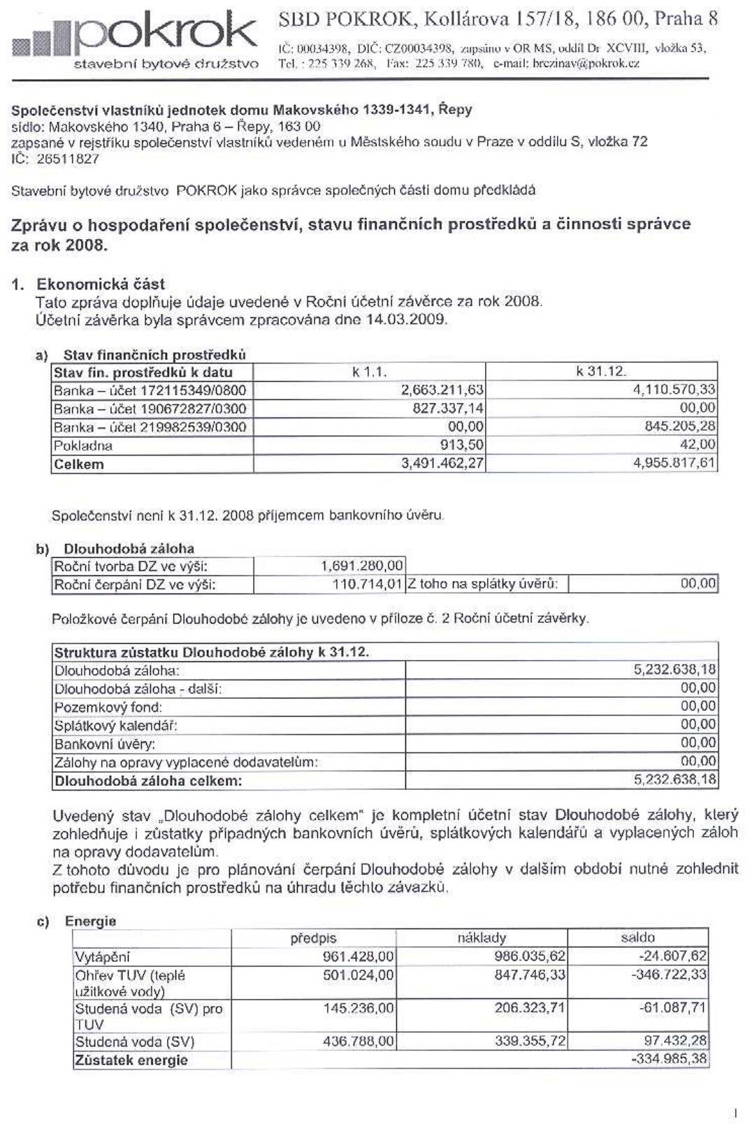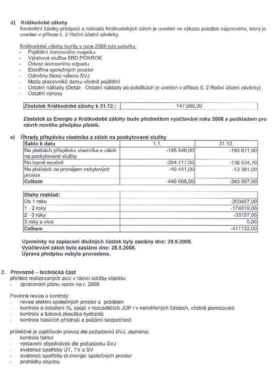- Ukládá výboru vlastníků věnovat větší pozornost průběžné kontrole účetních dokladů proplácených Pokrokem z b.ú. sdružení.Dále K.K.navrhuje schůzku s odpovědným pracovníkem s SBD Pokrok.Věříme,že spolupráce s SBD Pokrok bude na lepší úrovni a nevyjasněné platby budou v nejbližší době vyjasněny.