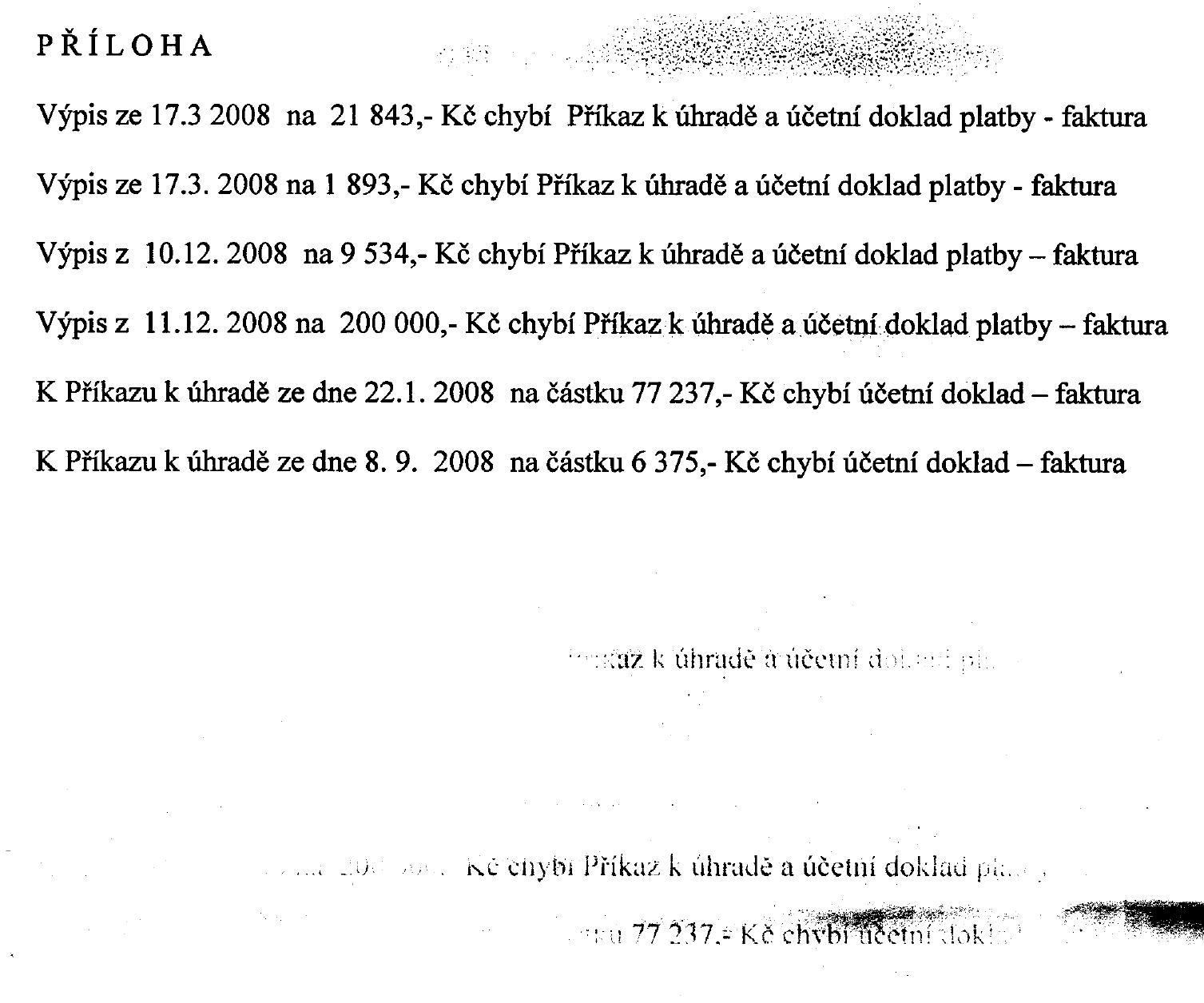 - U plateb z b.ú.viz Příloha chybí doklady o jaké platby se jednalo.Celkem se jedná cca 500 000.-Kč.