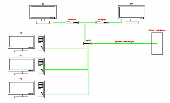 Přívod signálu do objektu je řešen přivedením optického singlemodového kabelu z výstupu z kolektoru směrem do objektu. Z důvodu vstupu do objektu kolektorem není třeba vrtat obvodové zdivo domu. V suterénních prostorách domu 3255 v blízkosti stoupacího vedení JOP bude na stěně umístěn optický rozvaděč (dále OR) o rozměrech 70x50x14 cm. V OR bude ukončen optický kabel. U OR je umístěno zařízení pro další distribuci signálu, domovní rozvaděč (dále DR) o rozměrech 80x60x20 cm. Pro DR bude zřízeno samostatné odběrné místo elektrického proudu. Elektroměr bude umístěn na volné pozici v JOP. Většinou je umístěno jedno OR a DR pro tři vchody domu (pro Váš objekt tedy jedno OR a DR).. Další distribuce signálu po objektech je řešena kabelem UTP cat.5 (sekundární vedení). Tyto kabely budou rozvedeny z DR a budou dále zataženy do JOP a ukončeny dle potřeby v jednotlivých podlažích objektů. Kabely budou vedeny ve vrapované PVC trubce Ø 50mm (husí krk, dále HK). HK budou přichyceny ke stávajícím roštům, v místech kde to nebude možné, budou HK připevněny na hmoždinky ke stěně (stropu) chodby, popřípadě do lišt. Umístění HK bude provedeno v souladu s platnými technickými normami a se souhlasem zástupce vlastníka objektu. K jednotlivým zákazníkům pak budou kabely zataženy po chodbě (umístění vedení kabelů bude provedeno tak, aby co nejméně narušovalo vzhled chodeb) v liště 10x10 mm na základě zájmu koncových uživatelů. Kapacita sekundárního vedení bude 80% počtu bytových jednotek. V bytových jednotkách je potom vedení položeno dle požadavků majitelů bytů, k jednotlivým koncovým zásuvkám. Všechny průvrty a průrazy budou po instalaci uvedeny do původního stavu. Bude použito standardního ručního nářadí (vrtačka), nedojde tudíž k nežádoucímu poškození dalších částí domu jako při použití pneumatických kladiv atd. Celková realizace není hlučná ani prašná. Z důvodu využití slaboproudé stoupačky (JOP) odpadá vrtání stropů (podlah). V případě potřeby se prostupy v JOP upravují ručně. Popis instalace zařízení v bytě zákazníka Do bytu zákazníka je ze stoupačky JOP, která je umístěna na chodbě domu, přiveden datový kabel UTP cat 5e, který je zakončen konektorem RJ 45. Tento kabel je zapojen do zařízení (switch), které zajišťuje rozvedení signálu do jednotlivých koncových zařízení (settopbox, počítač, WIFI router,...). Switch se umisťuje dle dispozic bytu a zcela individuálně dle požadavků klienta. Zpravidla ale "doprostřed bytu", aby se tahalo co nejméně kabeláže a vrtalo co nejméně děr do zdí. Switch potřebuje být napájen, proto je umístěn blízko elektrické zásuvky. Ke switchi se dají připojit dva settopboxy (dva televizní přijímače, na každém je možno koukat na jiný TV kanál a jiný nahrávat (v případě HDD settopboxu)) a tři počítače. Ke každému z těchto zařízení je tažen další kabel UTP, zakončený konektorem RJ 45, který zajišťuje přenos dat. Settopbox je připojen do TV buď SCART kabelem či moderním HDMI kabelem. Připojení PC je realizováno přes síťovou kartu, do které je připojen UTP kabel vedoucí ze switche. Připojení PC pomocí WIFI (bezdrátová síť) je samozřejmě možné, ale bohužel zařízení